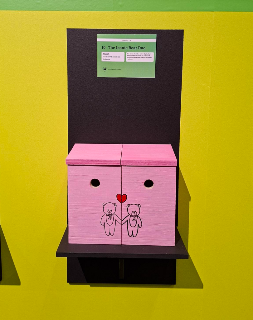 Två elever från Margarethaskolan har tagit sig till final i SM i fågelholk – en rikstäckande tävling arrangerad av Naturskyddsföreningen. Av 977 bidrag har deras kreativa fågelholk, “The Iconic Bear Duo”, valts ut som en av 15 finalister. Bidraget föreställer två rosa björnar som håller varandra i hand och visar prov på både fantasi och hantverksskicklighet.